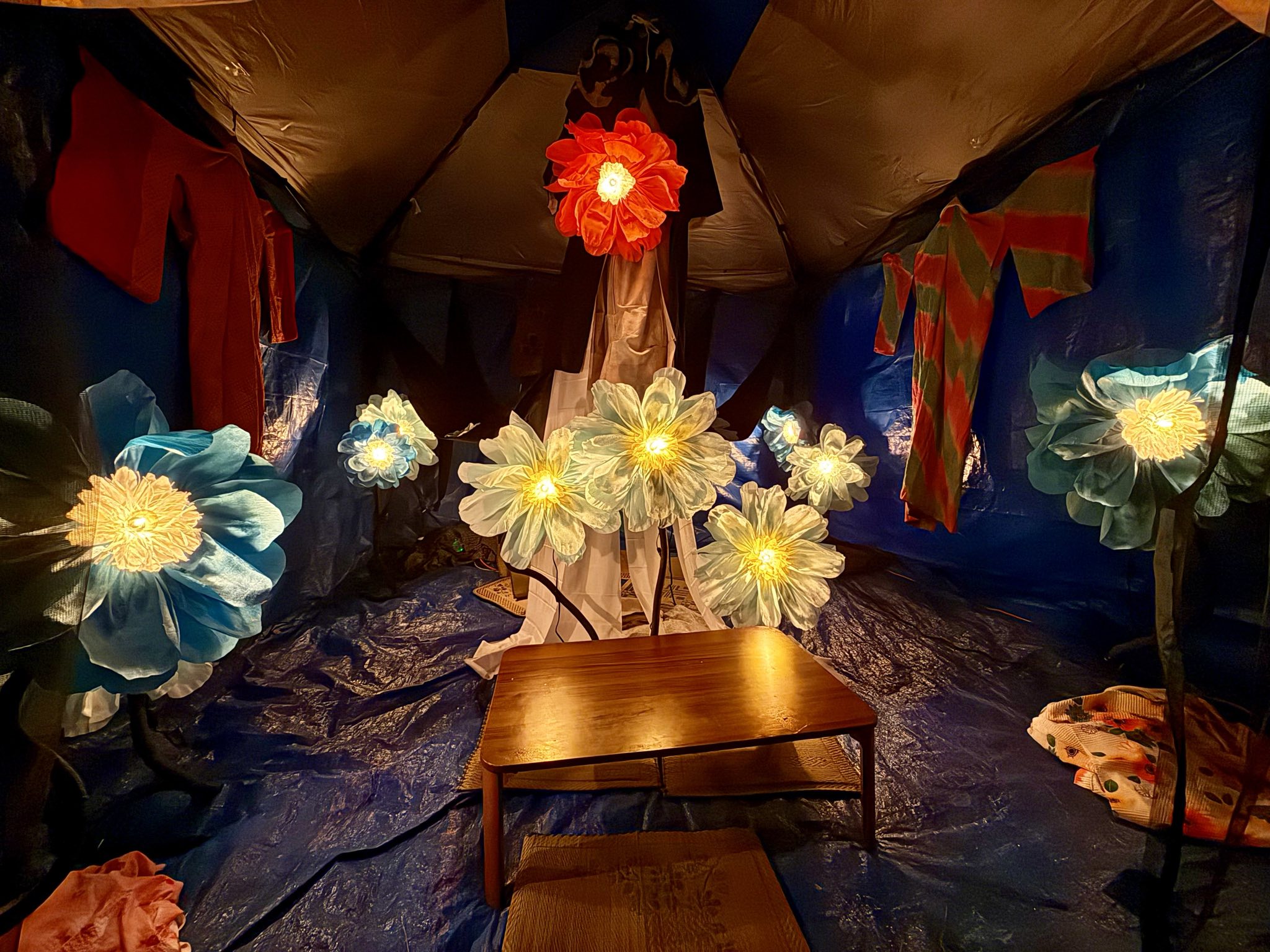 Using sourced kimono from the makerspace, installed large multi-petal crepe paper flowers with LED bulbs and displayed kimono to light up a quiet space for people to rest